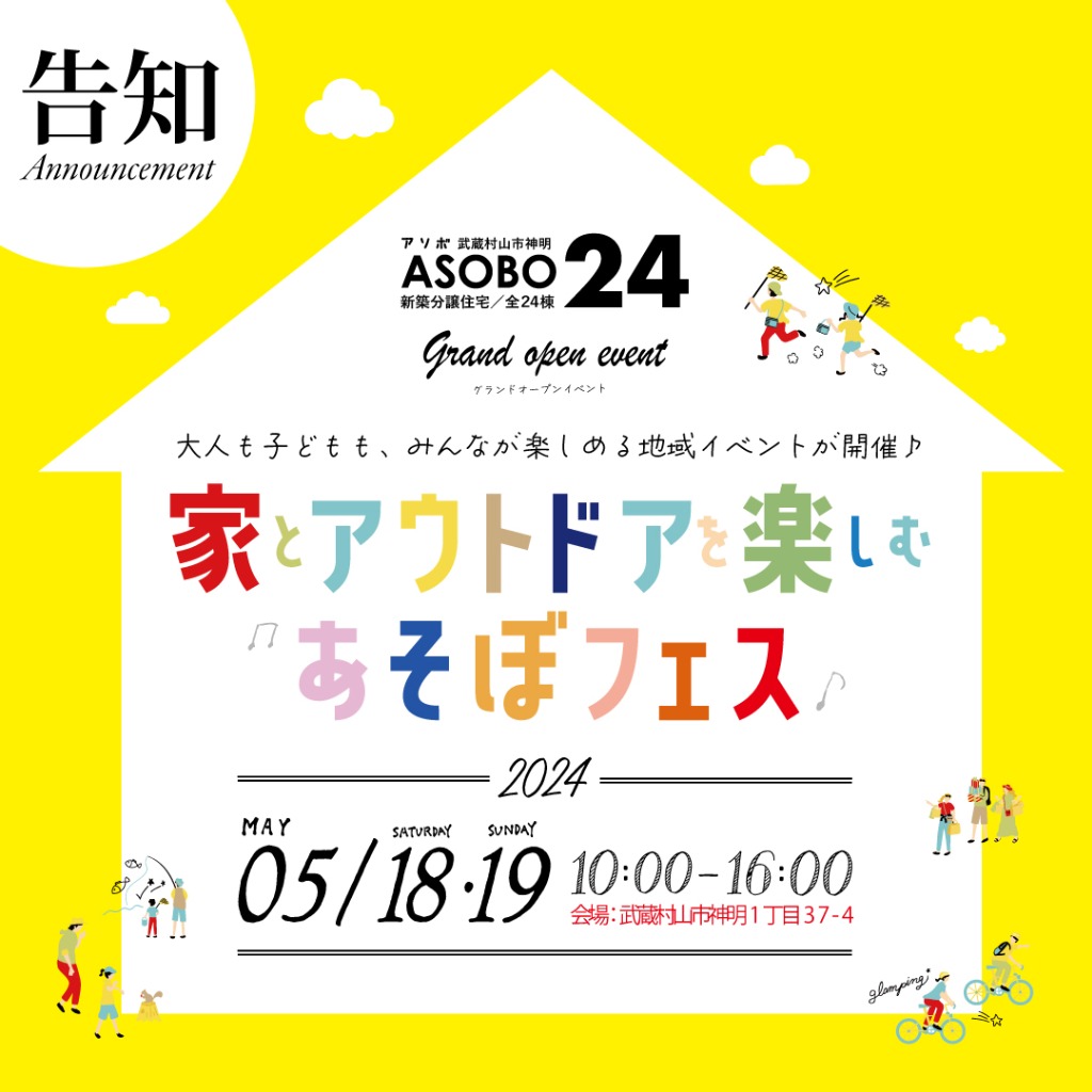 5月18日土曜日、武蔵村山市の神明1丁目で、(株)住協さんが主催するイベント「ASOBO24~家とアウトドアを楽しむ あそぼフェス~」に出店いたしますので、ぜひご来場ください。